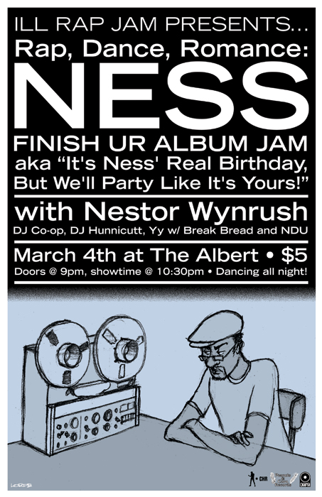 Rhymes by Nestor, Bird, Badd Mannaz, Len Bowen, and Yy. Cuts by DJ Brace, production by Muneshine. Illo and design by moi, of course.
